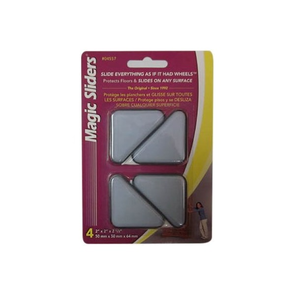 4 Pack, 2 x 2 x 212, Triangle Sliders, Moves Up To 3,200 LB, Won't Scratch Your Floors, Works On Any Kind Of Surface, Wood Floors, Vinyl, Ceramic Tile, Carpeting For End Panel, Square Corner, Solid Based Items, Adhesive Included, Carded
