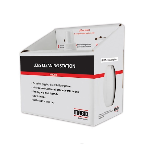 Magid's line of economy size lens cleaning stations come with disposable tissues and lens cleaning pumps Perfect for cleaning glass, plastic and polycarbonate lenses and surfaces Each station contains interfolded 5 x 8, nonabrasive tissues and pump dispenser of antifog, antistatic lens cleaning fluid Completely assembled, readytouse with precut openings for easy hanging Stations available in small 8 oz dispenser and 600 tissues and large 16 oz dispenser and 1200 tissues