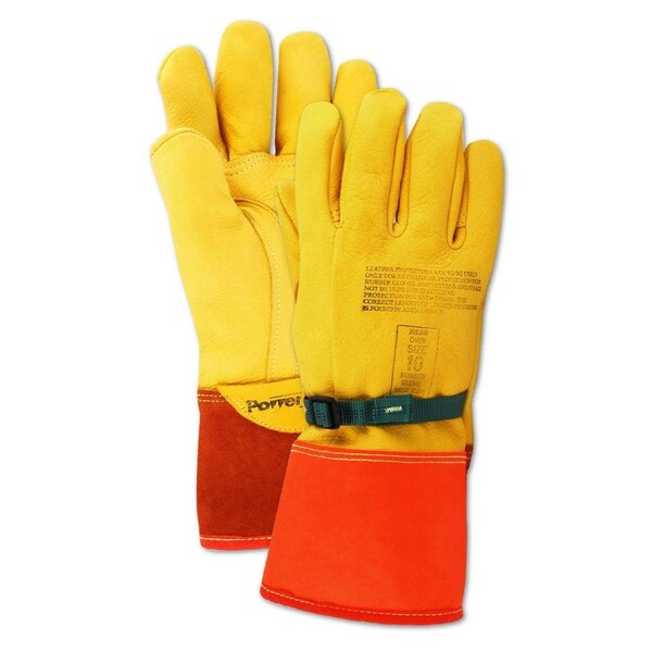 Magid's PowerMaster 60606PIO lineman's glove is a yellow deer grain leather high voltage protector glove This comfortable style features a pull strap and plastic buckle on the back for a great fit, a 45 fluorescent orangeback cuff for high visibility, and a tan split leather front cuff for added protection beyond the wrist This durable glove will extend the life of any rubber linesman glove worn underneath Leather protector gloves are meant to protect the electrical glove underneath, and offer no inherent electrical protection of their own
