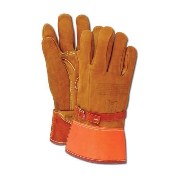 Magid PowerMaster 608483 Red Buffeted Cowhide Safety Glove is an all leather linesman glove, constructed from red buffeted cowhide for superior glove durability The glove's back cuff is an orange color with a tan split front cuff A nylon strap with a plastic buckle is in place for an easier, more secure fit The electrical high voltage gloves also contain an orange back cuff, and tan split front cuff