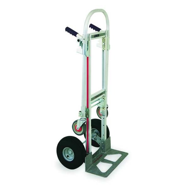 Convertible Hand Truck, Load Capacity as Hand Truck 500 lb, Load Capacity as Platform Truck 1,000 lb, Platform Height 10 1/2 in, Platform Length 38 in, Platform Width 12 in, Nose Plate Depth 7 1/2 in, Nose Plate Width 18 in, Nose Plate Type Solid Straight, Nose Plate Profile Beveled, Frame Finish Plain, Frame Material Aluminum, Frame Type Flat Back, Handle Type Dual
