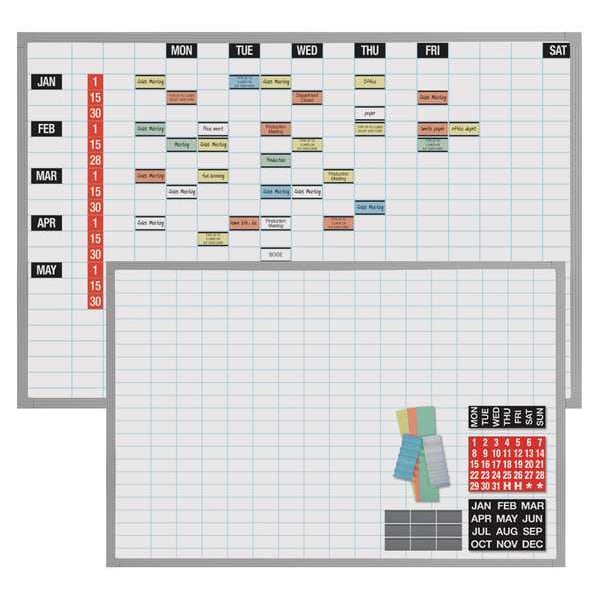 Dry Erase Grid Board, Board Properties Magnetic, Mounting/Mobility Type Wall Mounted, Board Color White, Dry Erase Height 36 in, Dry Erase Width 48 in, Frame Color Silver, Board Frame Material Aluminum, Frame Material Aluminum, Dry Erase Surface Type Porcelain, Corner Shape Square, Includes 1 in x 2 in Magnetic Cardholders, Multi-Color Data Cards, Month/Day/Date Headings