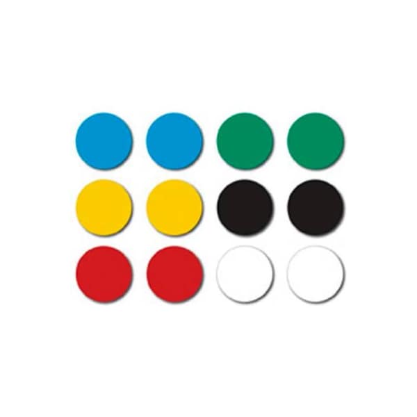 Magna visual high energy magnets, 3/4"w x 3/4"h, 12/pack these strong magnets hold up to 4 sheets of 8.5" x 11" paper. 12 magnets per package (2 ea. Red, green, yellow, black, white and blue)