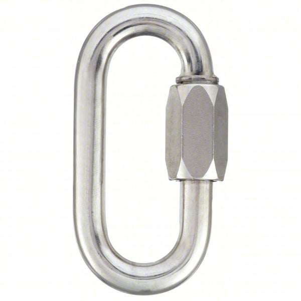 Connecting Link, Grade 30, Link Type Quick Link, Overall Length 3 1/8 in, Material Stainless Steel, Overall Width 1 1/8 in, Product Type Connecting Link, Compatible Chain Trade Size 3/8 in, Trade Size 3/8 in, Working Load Limit 1,980 lb, Finish Plain, Number of Coupling Links Not Applicable, Lifting Capability Not for Lifting, Inside Length 2 7/16 in, Standards CE Rated Safety Factor 4:1, Fabrication Forged, Weight 0.231 lb, Inside Width 3/4 in, Compatible Chain Grade 30