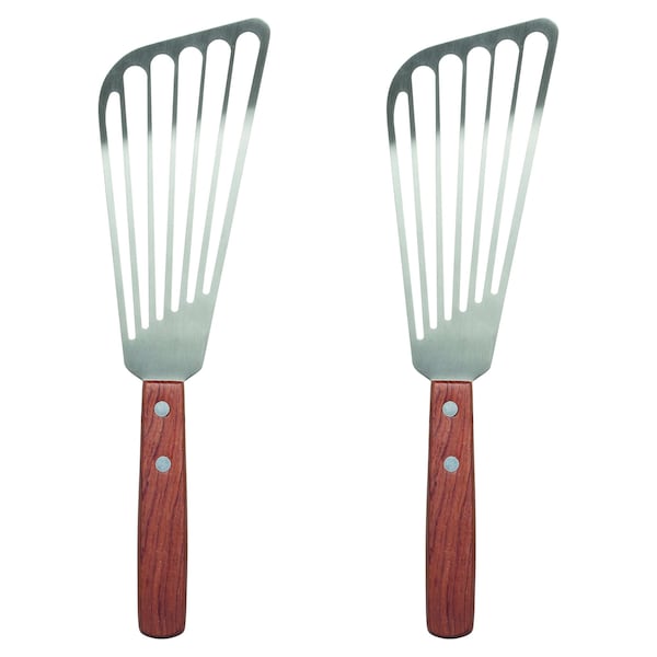 Maine Man's set of 2 Fish Spatulas for lifting and turning delicate fish and draining cooking oils and liquids for easy serving Made from 18/8 stainless steel and rosewood; Proposition 65 compliant; set of 2; each measures 11.25 x 2.75 x 2-inches Angled blade easily slides under fish and gently lifts it without it breaking apart; slotted design drains liquids freely yet cradles fish securely Perfect for whole or fileted fish, omelets, crepes and eggs, burgers, hash browns, and grilled sandwiches Hand wash in warm, soapy water