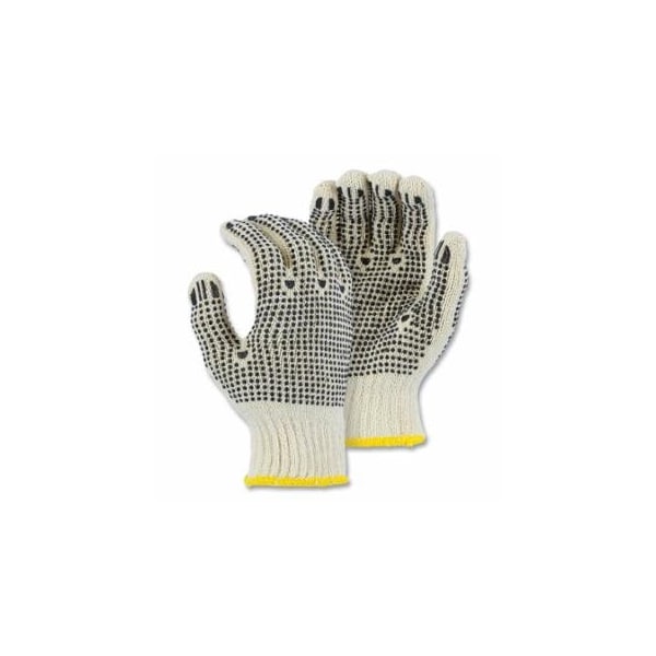 String Knit Gloves, Size 9/Medium, Knit Wrist Cuff, Natural with PVC Dots, 12PK