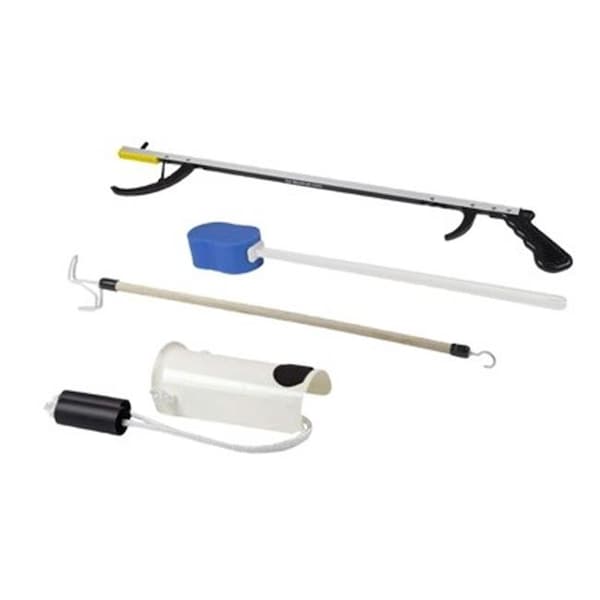 FabLife Hip kits include a variety of aids-to-daily living (ADL) products in one convenient package. Items help people avoid bending at the hip. This kit includes: 32" reacher, contoured sponge, formed sock aid, 24" dressing stick. FabLife Hip Kit: 32" reacher, contoured sponge, formed sock aid, 24" dressing stick