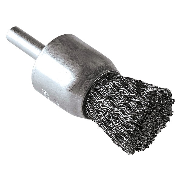 Wire Wheel Brush, Quick Change System Not Applicable, Bristle Type Crimped Wire, Bristle Material Carbon Steel, Brush Dia. 1 in, Wire Dia. 0.014 in, Bristle Length 7/8 in, Grit Not Applicable, Compatible Tool Type Right-Angle Grinder, Color Not Applicable, Connector Type Shank, Connector Size 1/4 in, Operating Speed - Maximum 4,500 RPM, Shank Length 1/4 in