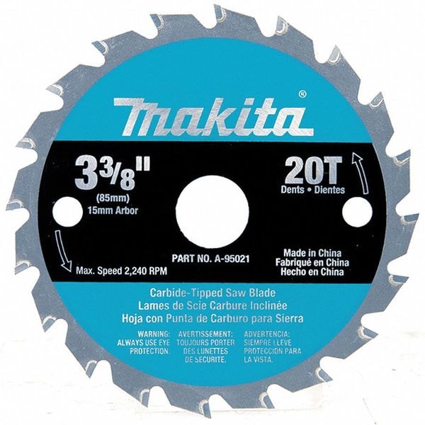Circular Saw Blade, Blade Dia. 3 3/8 in, Arbor Size 9/16 in, Diamond Knockout Diamond Knockout Not Included, Number of Teeth 20, Metal Cutting Type Thin Metal, Wood Cutting Type Not Applicable, Cut Width 0.04 in, Tip Material Carbide, Hook Angle 24 Degrees , Tooth Grind ATB, Blade Type Combination, Plate Thickness 0.028 in, Application Wood Cutting