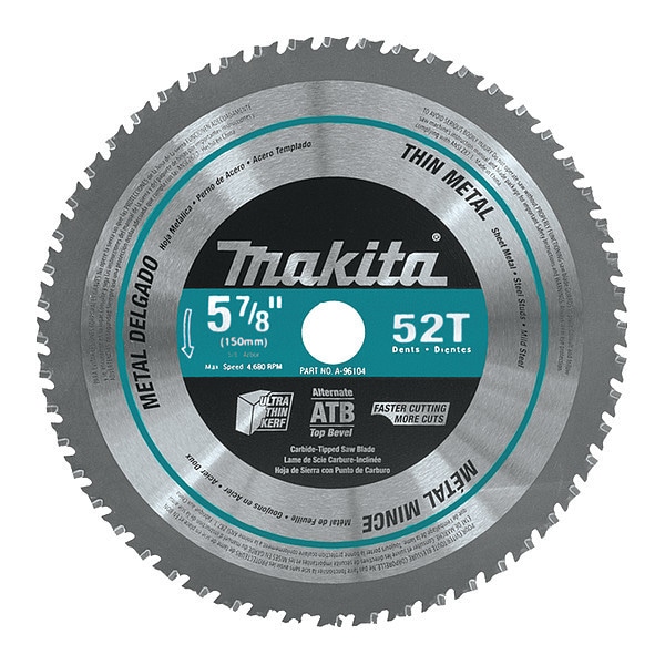 Circular Saw Blade, Blade Dia. 5 7/8 in, Max. Blade Speed 4,680 RPM, Arbor Size 5/8 in, Arbor Shape Round, Diamond Knockout Diamond Knockout Not Included, Number of Teeth 52, Primary Material Application Aluminum, Non-Ferrous Metals, Materials Cut Aluminum, Non-Ferrous Metals, Metal Cutting Type Thin Metal, Wood Cutting Type Not Applicable, Blade Thickness 0.043 in, Cut Width 0.06 in, Tip Material Carbide, Hook Angle -15 Degrees , Tooth Grind ATB, For Use With Saw Type Circular Saws