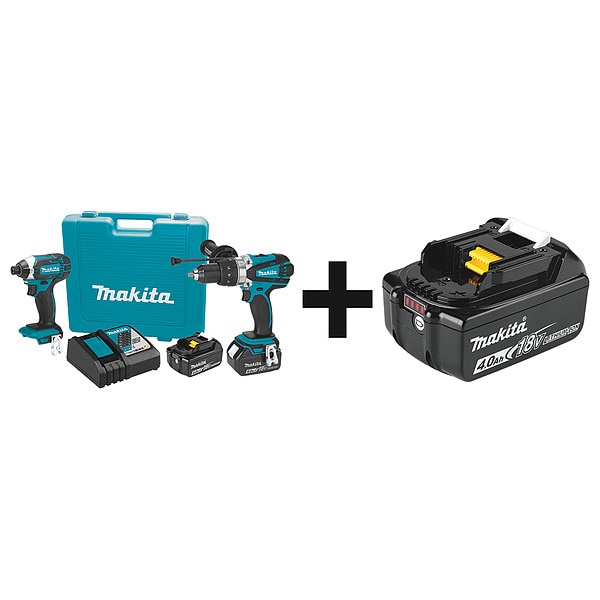 Cordless Combination Kit, Cordless Tools Included Hammer Drill, Impact Driver, Voltage 18 V DC, Power Source Cordless, Number of Tools 2, Battery Capacity (3) 4.0 Ah, Includes (3) Batteries, Charger, Contractor Bag, Tool Brand Makita, Series 18V LXT, Battery Included (3) 33RT43, Mfr. No. BL1840B, Number of Batteries Included 3, Battery Model No. (3) Mfr. No. BL1840B, Battery Series LXT(R), Charger (1) Mfr. No. DC18RC, Charger Included Yes