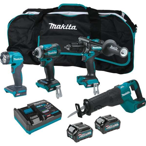Cordless Tool Combination Kit, Cordless Tools Included Flashlight, Hammer Drill, Impact Driver, Reciprocating Saw, Voltage 40 V DC, Power Source Cordless, Number of Tools 4, Battery Capacity (1) 2.5Ah, (1) 4.0 Ah, Includes Reciprocating Saw Blade, Tool Bag, (2) Belt Hooks, Tool Brand Makita, Series XGT(R), Battery Included (1) 373WA7 (Mfr No. BL4025), (1) 373WA8 (Mfr No. BL4040), Number of Batteries Included 2, Battery Model No. (1) 373WA7 (Mfr No. BL4025), (1) 373WA8 (Mfr No. BL4040)