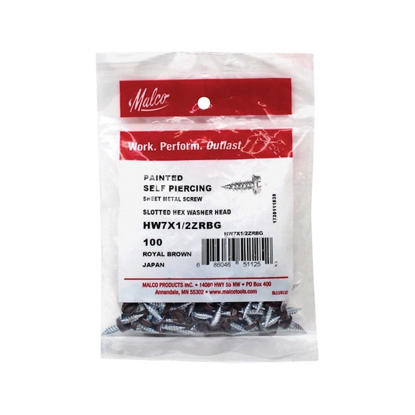 Features Slotted hex sheet metal screws Heads resist stripping out of hex driver openings Slots on flat, no corners Heat-treating process produces fine, sharp points with strength Single starting threads help penetrate material Second threads above each point engage after initial penetration and help drill the screws in quickly Capacity for fastening heavy sheet metal gauges Specifications Head Type: Slotted Drive Type: Hex Material Type: Metal Callout Size: No 7 Length: 1/2in Container Size: 100 per box Point Type: Drill Thread Type: Tapping Color: Royal Brown Self Drilling: Yes Finish: Zinc Head Size: 1/4in