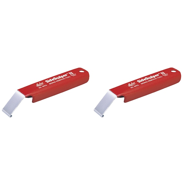 SideSwiper model SRT2 combines the comfort and added leverage of an easy-to-grasp straight handle with the smooth unlocking motion of a burr free hook. The blade of the SRT2 is angled from the bottom plane of the handle and allows the user to keep the wrist straight while keeping knuckles well above the work. Blade surface finishing and plating ensures that the sharply angled hook will not cut into the vinyl material or produce shavings. Additional comfort and control is achieved with a non-slip textured handle grip. The gripping surface will not become slick from moisture, and the form fitting, plastisol dip process bonds the grip for the life of the tool. Durable one piece spring steel construction is virtually indestructible. A handy oversize hang hole in handle accommodates a 1/4" (6.4 mm) peg hook. 2 piece set.