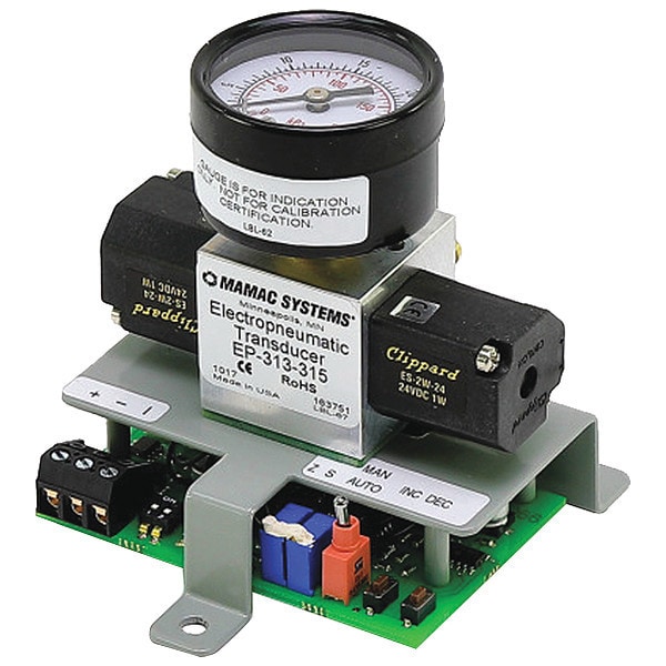 Transducer, Air Connection Size 1/4 in, Application Clean Dry Air/Inert Gas, Electrical Connections Screw Terminal, Input Current Signal Maximum 20 mA, Input Current Signal Minimum 4 mA, Input Signal Type Current/Voltage, Input Voltage Signal - Maximum 10V DC, Input Voltage Signal - Minimum 0V DC, Operating Pressure - Maximum 40 psi, Operating Temperature - Maximum 150 Degrees F, Operating Temperature - Minimum 25 Degrees F, Overall Depth 3 5/16 in, Overall Length 3 1/4 in