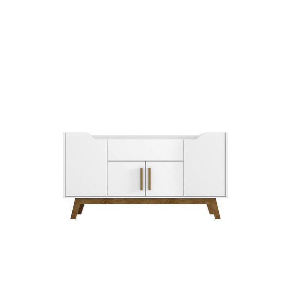 Mid Century - Modern Buffet Stand and Sideboard for Dining and Living Room Use. * Upon Assembly, Measures: 53.54 in. Length, 31.89 in. Height, 14.17 in. Depth. * Recommended for a 65" TV. * Ample Storage: Includes 1 Drawer, 4 Doors, and 5 Cubby Spaces. * Stylish Dip Tray Sideboard Top with Vertical MDF Door Handles. * 90° Open Door Style Including Soft Close Features. * Fashionable Framed Base Splayed Legs made from Solid Wood for Extra Durability. * Home Assembly Required. All Hardware Included