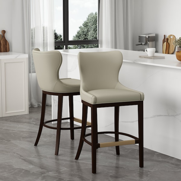 Elevate your everyday with this stools effortlessly sophisticated silhouette. A gently curved backrest and plush padded seat deliver the perfect balance of style and support, wrapped in smooth leatherette for a sleek, modern feel. The dark wood frame is grounded in warmth, while a gold-finished footrest adds just the right touch of polish. Whether you're sipping coffee or sharing cocktails, this stool brings comfort and elegance to every moment.