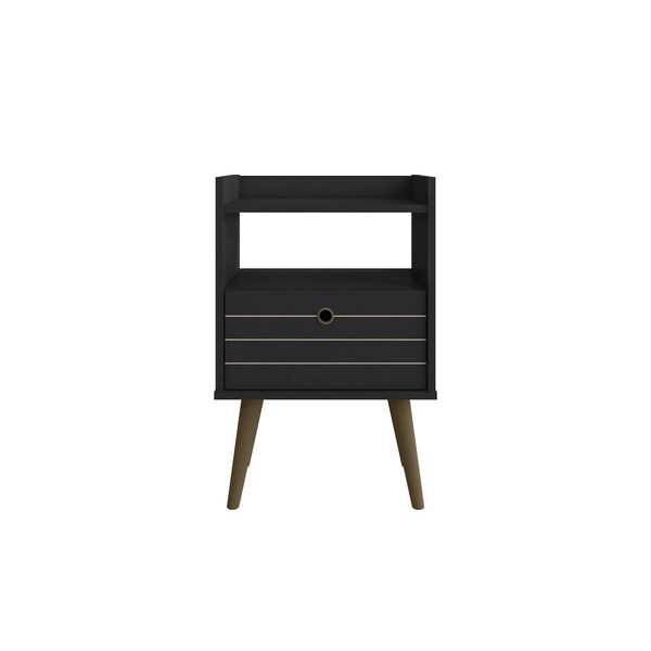 Mid-Century Modern Nightstand for Bedroom Use. * Upon Assembly, Measures: 17.71 in. Length, 27.16 in. Height, 14.17 in. Depth. * Includes 1 Open Shelf and 1 Drawer. * Ring Hollow Drawer Handles * Multi Color with Nature Tray Top Design Adding Design and Sophistication to this Product. * Fashionable Splayed Legs made from Solid Wood for Extra Durability. * Perfect for Storage or Display Items. * Home Assembly Required. All Hardware Included.
