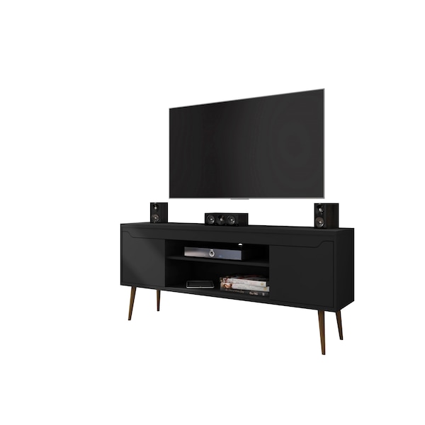 Beautifully crafted and built to last, the Bradley TV stand has plenty of style and charm, instantly upping your design game. This piece makes functionality and storage look chic and seamless, with open shelving to display media accessories, DVD players, books, and beyond, and two storage cubbies concealed behind two artful cabinet doors. Set your TV center stage or hang it above the unit to draw your favorite people together for a great movie night in. Grab the hidden wine glasses or snack bowls from the cabinet below and settle in for the perfect evening.