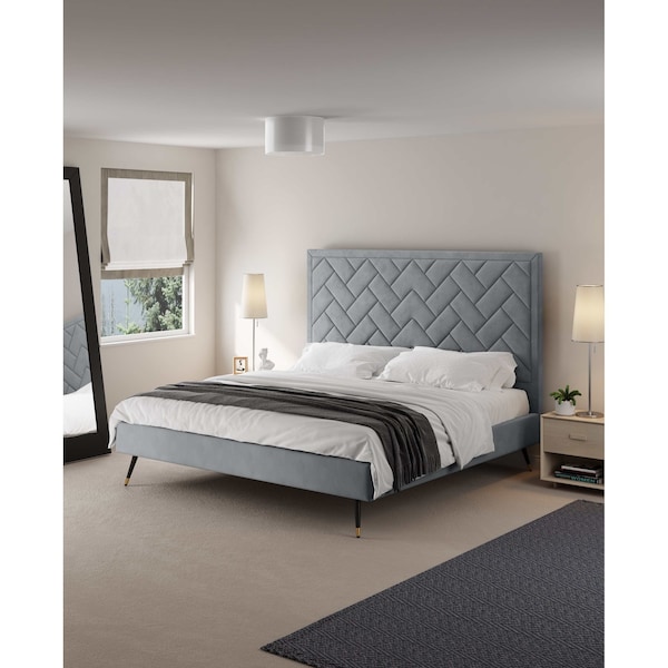 This platform bed anchors your bedroom in glam, mid-century-inspired style. It's built with an engineered wood frame and features understated side rails and footboard for a clean-lined silhouette. The headboard is upholstered in a luxurious velvet that features chevron style weave stitching. Plus, it's filled with foam for some extra cushion behind your head. Angled black iron legs with gold tips support the bed with a retro aesthetic. This bed arrives with slats and a center support leg, so you don't have to use a box spring with your choice of mattress.