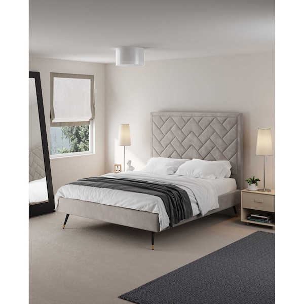 This platform bed anchors your bedroom in glam, mid-century-inspired style. It's built with an engineered wood frame and features understated side rails and footboard for a clean-lined silhouette. The headboard is upholstered in a luxurious velvet that features chevron style weave stitching. Plus, it's filled with foam for some extra cushion behind your head. Angled black iron legs with gold tips support the bed with a retro aesthetic. This bed arrives with slats and a center support leg, so you don't have to use a box spring with your choice of mattress.
