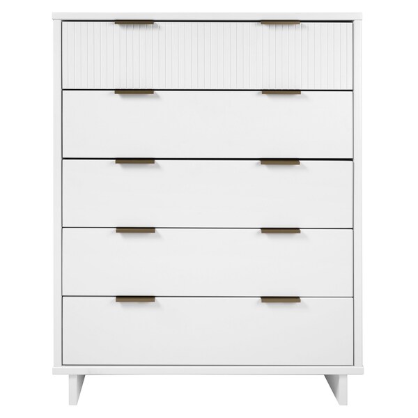 Modern- Contemporary with a taste of Glam - Tall Dresser for Bedroom Use. * Upon Assembly, Measures: 37.95 in. Length, 49.21 in Height, 17.71 in. Depth. * Includes 5 Full Extension Drawers with Top Drawer Designed in Vertical Textured Ribbed Lines Made from Solid Wood. * Horizontal Glam Drawer Handles Made of Streel with a Gold Finish. * Featuring 25mm of Board Thickness Made of High Quality MDF and Solid Wood Ribbed Drawer Front. * Open Contemporary Mop Base Side Legs. Adding Seamless Fashion Design and Durability. * Recommended for up to 35 inch TV. * Home Assembly Required. All Hardware Included.