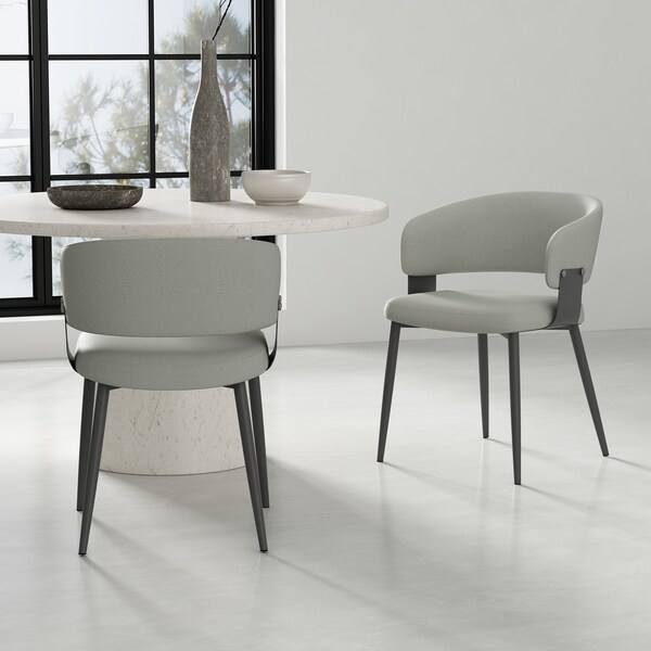 Bold in form and refined in detail, this dining chair pairs sculptural lines with the durability of textured leatherette. The curved backrest hugs you in comfort while the sturdy metal frame delivers modern edge. Designed for both casual meals and elevated hosting, its a versatile piece that brings character and comfort to any table setting.