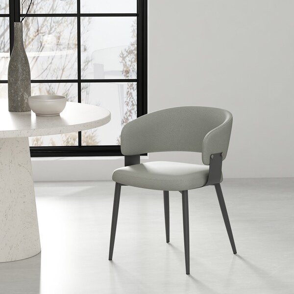 Bold in form and refined in detail, this dining chair pairs sculptural lines with the durability of textured leatherette. The curved backrest hugs you in comfort while the sturdy metal frame delivers modern edge. Designed for both casual meals and elevated hosting, its a versatile piece that brings character and comfort to any table setting.