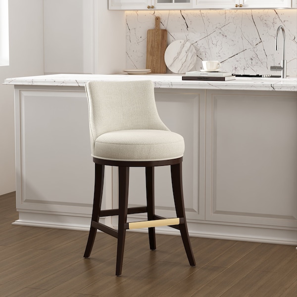Elevate your everyday seating with a stool that blends tailored elegance and thoughtful comfort. Wrapped in richly textured chenille, this stool invites you in with a curved backrest, offering both style and support. The generously cushioned seat and the dark walnut wood frame grounds the piece with a timeless warmth. A gleaming gold footrest adds a refined touch, making this stool a perfect companion for your everyday.