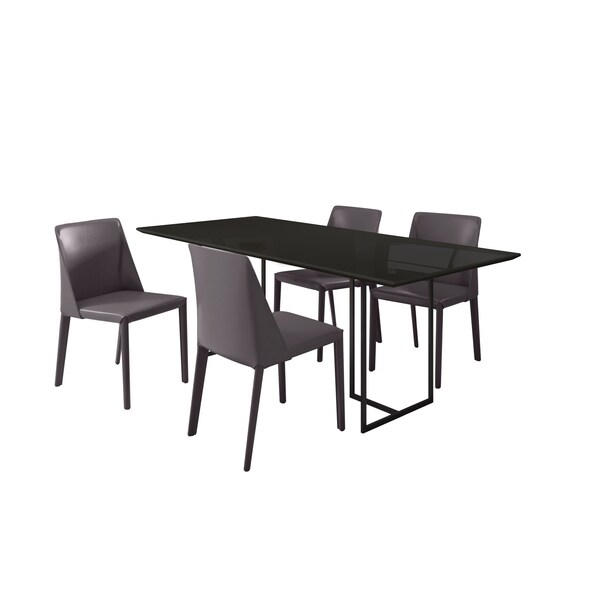 Modern 5-Piece Full Dining Set for Dining Room Use. * Table Measures: 86.22 in. Length, 30.94 in. Height, 39.37 in. Depth. Chair Measures: 18 in. Length, 31.5 in. Height, 20.87 in. Depth. * Includes 1 Dining Table and 4 Dining Chairs. * Geometric Spacious Table Legs with Seating Space Capacity for 8 Persons. * Features a Rounded Table Top Edge which Include a 4 MM Glass Top that is Not Removable. Legs Made of Carbon Steel with Black Finish for Fashion and Durability. * Chairs 100% Tailored Upholstery from Top to Bottom. Legs Included. * Upholstered In Saddle Leather. * Minimal Table Assembly Required. All Hardware Included.