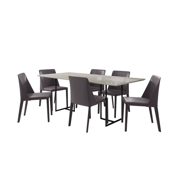 Modern 7-Piece Full Dining Set for Dining Room Use. * Table Measures: 86.22 in. Length, 30.94 in. Height, 39.37 in. Depth. Chair Measures: 18 in. Length, 31.5 in. Height, 20.87 in. Depth. * Includes 1 Dining Table and 6 Dining Chairs. * Geometric Spacious Table Legs with Seating Space Capacity for 8 Persons. * Features a Rounded Table Top Edge which Include a 4 MM Glass Top that is Not Removable. Legs Made of Carbon Steel with Black Finish for Fashion and Durability. * Chairs 100% Tailored Upholstery from Top to Bottom. Legs Included. * Upholstered In Saddle Leather. * Minimal Table Assembly Required. All Hardware Included.