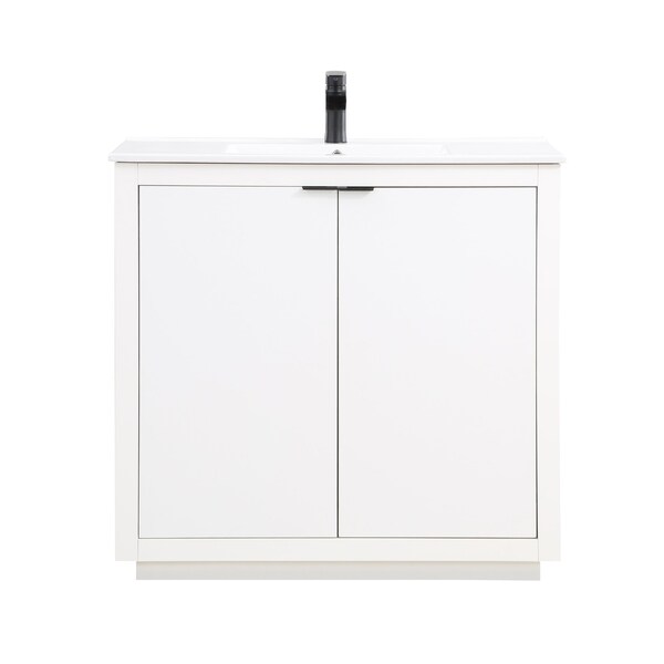 Modern Vanity with Sink for Bathroom and Sink Use. * Upon Assembly, Measures: 36 in. Length, 34.75 in. Height, 18.25 in. Depth. * Ceramic Counter Sink Top Included with the Vanity. * Sink Dimensions: 24" Length, 18.125" Width, 5.125" Depth. * Single-Hole Center set Faucet Installation Type. Faucet and Drain Not Included. * Includes Soft Close Cabinet Doors with Metal Handles, and 1 Inner Shelf Perfect for Towels and Bathroom Product Storage. * Coordinates with Standard Faucets and Standard 1.7" Drain. Features Chrome-Finish Overflow. * Home Assembly Required. All Hardware Included.