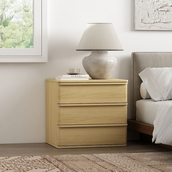 This nightstand is the perfect companion for your quiet evenings and peaceful mornings. Its softly rounded edges and natural oak finish evoke a sense of warmth and intimacy, inviting you to unwind in its timeless charm. With ample storage tucked behind its graceful silhouette, it holds your cherished bedtime essentials close, blending seamlessly into your sanctuary. Let it be the understated elegance that completes your bedroom, turning every moment into a serene escape.