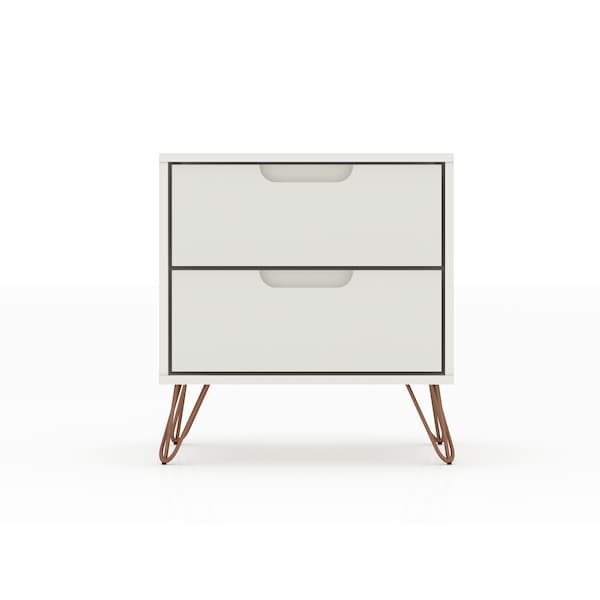 The Rockefeller nightstand is the perfect bedside table, with two drawers that are ideal for tucking away personal items, tablets, books, and beyond. Versatile in design with Mid-Century clean lines and modern splayed metal legs, this piece blends well with any existing decor and can be used from space to space.