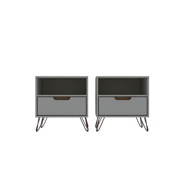 Moonlighting as an end table or armchair sidekick, the Rockefeller nightstand is seamless and sophisticated, with plenty of Mid-century flair, enhanced by edgy metal splayed legs, cutout drawer handles, and clean lines, to feature one sophisticated design. Tuck away remotes, books, tablets, and more, in the concealed drawer space, and keep magazines, laptops, or books, in the open shelf space for easy access. Add a decorative lamp and favorite framed photos on its base and set it in the living room or bedroom to finish off the space.