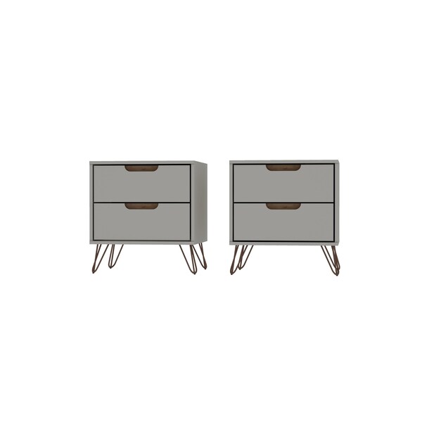 The Rockefeller nightstand is the perfect bedside table, with two drawers that are ideal for tucking away personal items, tablets, books, and beyond. Versatile in design with Mid-Century clean lines and modern splayed metal legs, this piece blends well with any existing decor and can be used from space to space.