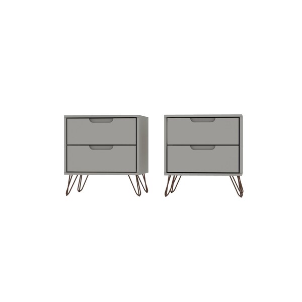 The Rockefeller nightstand is the perfect bedside table, with two drawers that are ideal for tucking away personal items, tablets, books, and beyond. Versatile in design with Mid-Century clean lines and modern splayed metal legs, this piece blends well with any existing decor and can be used from space to space.