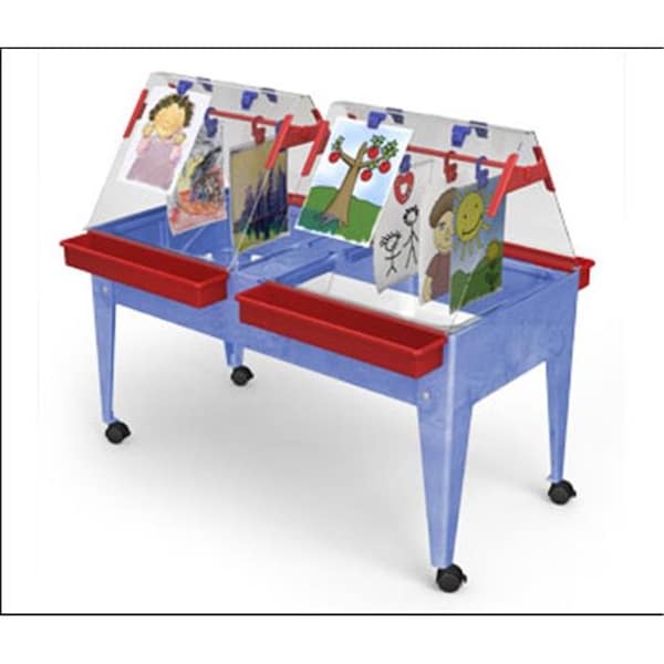 Room for 4 painters on the 2 clear sturdy plastic easels. Remove the easels to find a Double Mite Sand and Water Activity Center with (2) 9" deep clear plastic tubs. Includes 4 Super Caddies, 24 easel clips, and 2 white plastic lids. 4 easy-ride locking casters allow for super mobility. UPS Ground. Some assembly required.