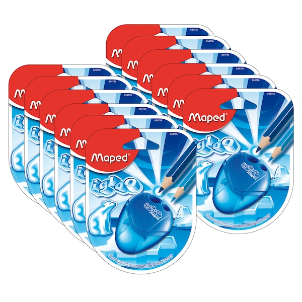 Maped Igloo 2-Hole pencil sharpener features an ergonomic shape for easy grip. Bright, transparent sharpener with shatter-resistant container is available in assorted colors: blue, orange and purple (no color choice). Accepts standard and jumbo-size pencils. Sold as a pack of 12 pencil sharpeners.