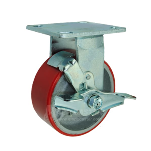 5"X2" Red Poly. on Iron Wheel Rigid Caster W/ Brake, 1,100 Lbs Cap