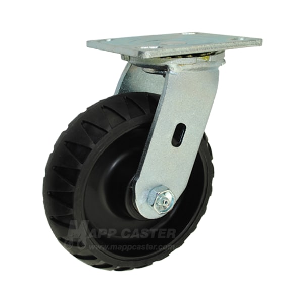 Thermoplastic Rubber Wheels combine the advantages of both a hard & soft tread material in a single wheel, making it one of our favorite caster wheels. Like a hard tread wheel, thermoplastic rubber rolls easily and is very durable. Like a soft tread wheel, it is quiet, protects floors, and has a cushioned ride. These caster wheels also hold up well when exposed to weather, are resistant to chemicals, water, & steam, and reject floor debris.This casters crowned & grooved wheel helps go over all types of terrains. We highly recommend these caster for applications requiring non-marking, floor protective, quiet, & smooth rolling wheels. We would notrecommendedthese wheels for applications that require sitting in one spot for long periods of time under heavy loads.