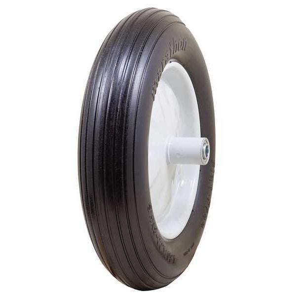 Flat-Free Wheel, 500 lb Load Rating, Ribbed Tread, 15 1/2 in Wheel Dia., 3 in Wheel Width, For Axle Size 5/8 in, 4.80/4.00-8, Standard Tire Rim Type, Center Mount Hub Position, 6 in Hub Length, Steel Hub Material, Yes Non-Marking