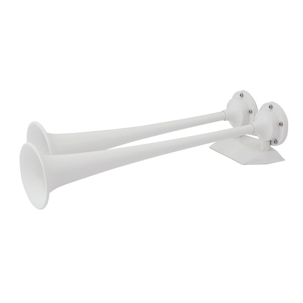 12V White Epoxy Coated Dual Trumpet Air Horn. The Marinco FullBlast compressor driven air horns are the loudest and most complete line of 12V air horns available. All of our air horns produce sound levels ranging between 120 and 127dB, which means all of our air horns meet the ABYC and NMMA regulations for boats up to 20 meters/66 feet.. Features: Fundamental frequency 375+/-15Hz, 315+/-15Hz. dB(A) rating 121 at one meter, 1/3 octave band.
