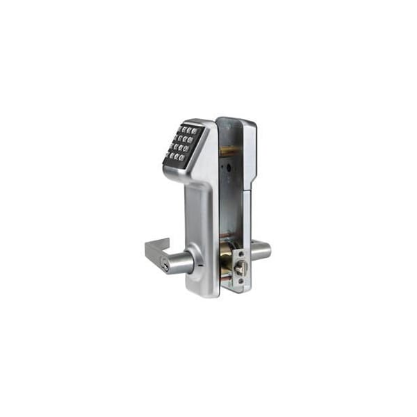 COMBINATION ELECTRONIC ACCESS DOOR LOCKS 160 USER CODE LOCK INTERCHANGEABLE CORE SATIN CHROME PLATING CYLINDRICAL PUSH-BUTTON GRADE-2 LOCKS PROVIDE SECURE, CONTROLLED ACCESS BETWEEN PUBLIC AND PRIVATE AREAS. CABLEGUARDĀ® BACKING PROTECTS WIRES FOR EASY INSTALLATION. FEATURES AUDIBLE AND VISIBLE ENTRY INDICATOR AND LOW BATTERY ALERT. PROGRAMMABLE USING 16-BUTTON TELEPHONE-STYLE KEYPAD. OPERATES USING 4 INCLUDED "AA" BATTERIES. FITS IN 1-3/4" THICK DOORS. INCLUDES 2-3/4" BACKSET LATCH AND 4-7/8" ASA STRIKE. WEATHERPROOF FINISH FOR OUTDOOR APPLICATIONS. FEATURES AUTOMATIC DAYLIGHT SAVINGS ADJUSTMENT, DOUBLE CODE ENTRY FOR EXTRA SECURITY, MANUAL PASSAGE MODE, OPENING TIME SETTING AND BATTERY CHECK STATUS. TEMPORARY USER SCHEDULE FEATURE RESTRICTS EXISTING USERS' ACCESS DURING A DATE RANGE. THREE-STRIKE LOCKOUT PROTECTS AGAINST TAMPERING. US26D CHROME FINISH. 160 USER CODE MODELS ARE PRE-PROGRAMMED AND KEYPAD PROGRAMMABLE. UL & CUL LISTED. ADA COMPLIANT. CORE NOT INCLUDED.
