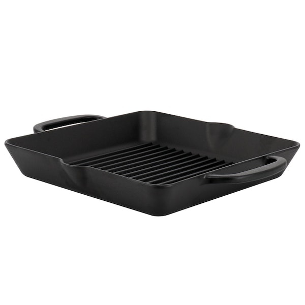 The Martha Stewart 12 Inch Square Pre-Seasoned Cast Iron Grill is perfect for cooking a variety of foods. This cast iron pan features grill marks for added texture with out the smoke of an outdoor grill. It comes pre-seasoned to help start the natural nonstick surface. The added built-in handles and pouring spouts make it easier to handle the pan and to plate savory sauces. Sear all sorts of meats, grill your favorite veggies or bake a healthy one pan meal.