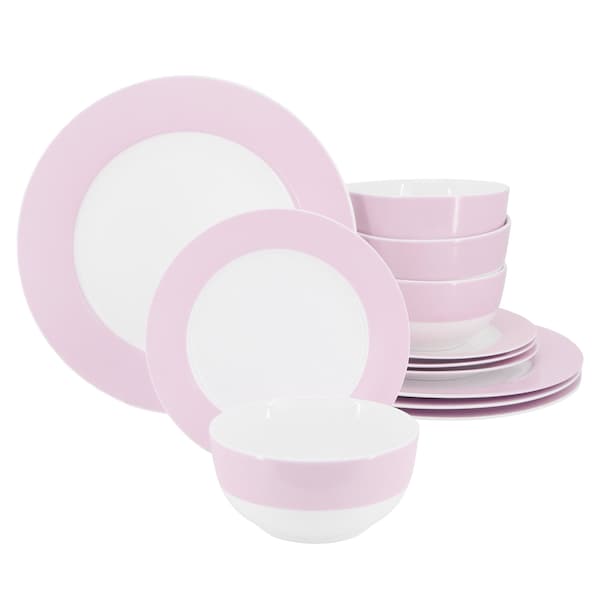12 Piece Banded Fine Ceramic Dinnerware Set in Blush Pink