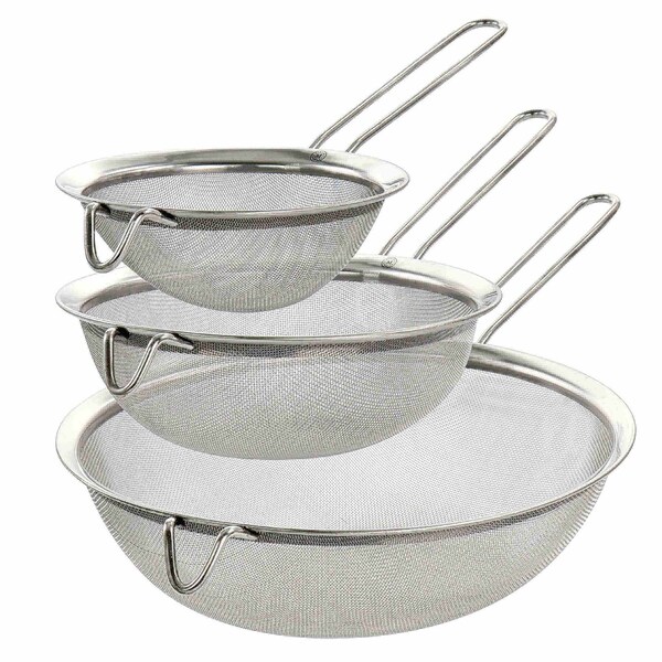 This three piece stainless steel frying strainer set comes with varying sized to fit snugly into a variety of pots and pans. With a nesting design for easy storage, long handles, and hooked ends, these frying strainers will fit perfectly atop a pot or a bowl for convenient use. Durable mesh is ideal for straining both large and small foods, and the stainless steel frame construction is durable for long lasting use.