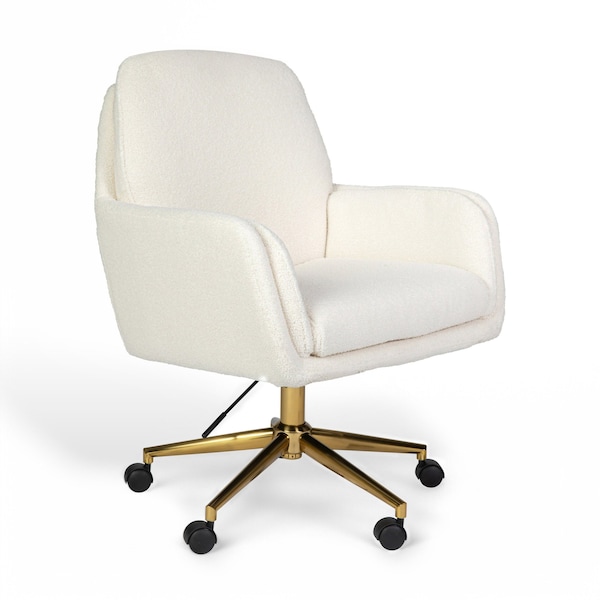 Transform your homes productivity hub with the elegance and supreme comfort of the Martha Stewart Clara Office Chair. A seamless addition to any design scheme, this chair combines a luxurious double-cushioned construction with modern aesthetics to enhance your workday. Showcase a contemporary appeal with an eye-catching boucle upholstery paired with a metal frame that boasts a stylish polished brass finish. The seats 360° swivel function and pneumatic, multi-position height adjustment lift provide limitless personalization so you can find the perfect fit for your unique space. Easily move about your home command center with dual wheel casters. Assembly is easy with the included tools and step-by-step instructions and maintaining your chairs beautiful appearance is simple by wiping clean with a dry cloth.