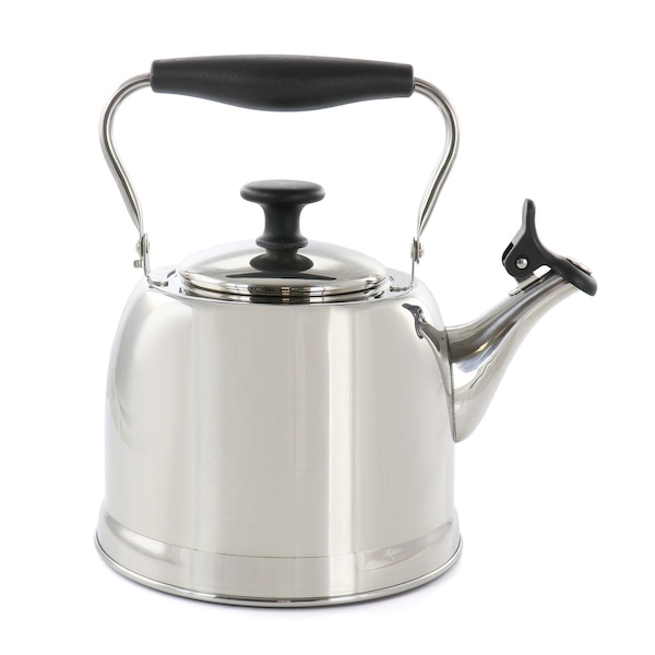 Heat up some water to enjoy a hot beverage with this Martha Stewart Everyday Lily Pond 2.2 Quart Stainless Steel Tea Kettle. Durable stainless steel construction means this kettle will last for years and serve you many warm drinks. A fold down handle with stay cool grip means this kettle is easy to fill and clean. Simply listen for the soft whistling noise to know when your water is boiling and rest assure the induction base is compatible with all cooktop types. Enjoy your favorite hot beverage year round with this gorgeous kettle!