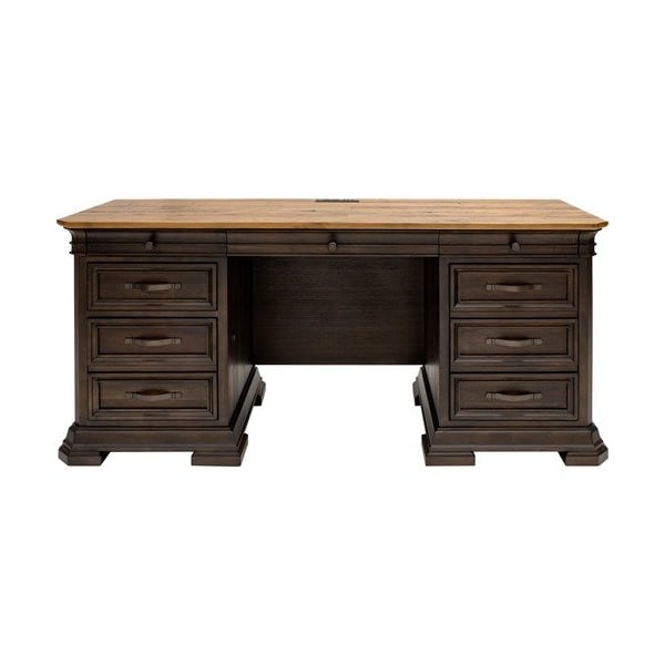 The Sonoma collection provides the elements to create a truly inspirational office environment. Hand-planked wood veneers in a rich, dark roast finish the color of freshly brewed coffee show highlights of natural wood that has aged and is mildly distressed. Distressing includes rasping, chopping, and worm holes along with varied species. Solid wood plank tops accent the dark finish and emphasize the wood's natural beauty for two-tone authenticity. Antique bronze hardware adds a shimmering touch.